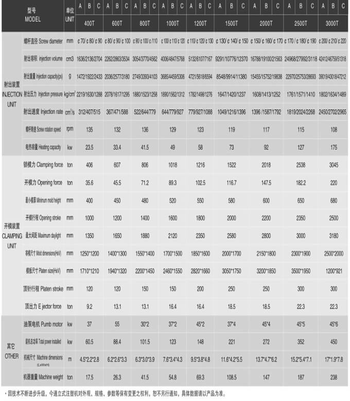 3、坚固的机身结构、超大的模板尺寸及注射量,为大型塑件的制造提供可能。 横式、立式射出及大型柱塞式射出设计,为大注射量。