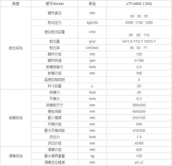 1、本款机器为JTT-450单滑板立式注塑机,锁模力:45T ;射出量:1-115g