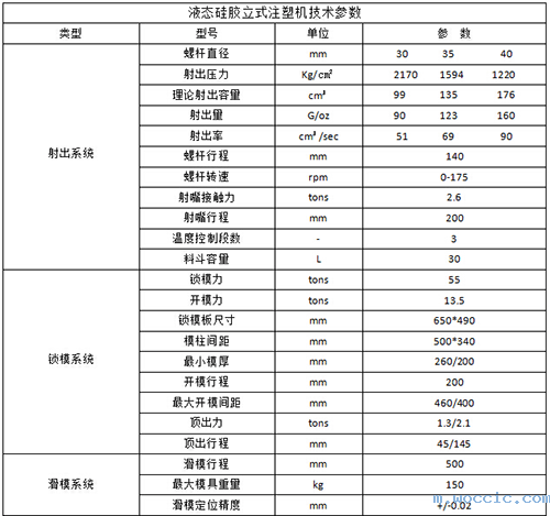 e.本款机器为55吨立式机,射出量:1-1407g,锁模力:55-160T